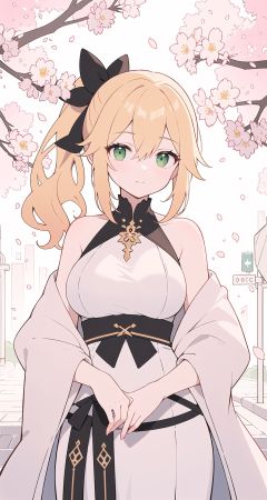 medium hair,wavy hair,side ponytail,blonde hair,green eyes,fantasy clothes,(white dress:0.8),large breasts,narrow waist,