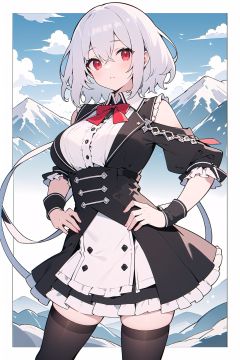 zettai ryouiki,(hanging breasts),(masterpiece, best quality, high quality, highres, ultra-detailed),short hair,silver hair,red eyes,wavy hair,breasts,frills,outdoors,mountain,close-up,alternate costume,