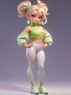 concept art pixar,3d style,masterpiece,best quality,good shine,OC rendering,best quality,4K,super detail,1girl,((full body)),looking at viewer,standing,shiny_skin,fair_skin,legs crossed, high-waisted leggings and crop top, Duchess, Tall, Athletic, Triangular Face, Fair Skin, White Hair, Hazel Eyes with Green Flecks, Short Nose, Pouty Lips, Receding Chin, Shoulder-Length Hair, Fine Hair, Ballerina Bun, augmented breasts, Stud earrings, berry metallic lipstick,light flesh hair,gyaru,absolute_territory,tight,spandex,shoes,kneehighs,glamor,dormitory,light grey background,clean background,straight_hair,hime cut, . digital artwork, illustrative, painterly, matte painting, highly detailed