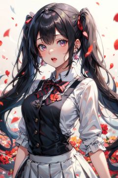 (masterpiece,bestquality),agirl,solo,twintails,shirt,skirt,petals,bowtie,earrings,jewelry,bangs,blackhair,hairornament,hairribbon,redribbon,redeyes,longhair,openmouth,whiteshirt,multicoloredhair,blackskirt,redhair,longsleeves,pinkbowtie,hairbetweeneyes,lookingatviewer,collaredshirt,upperbody,handup,fallingpetals,depthoffield,strongbloom,redbackground