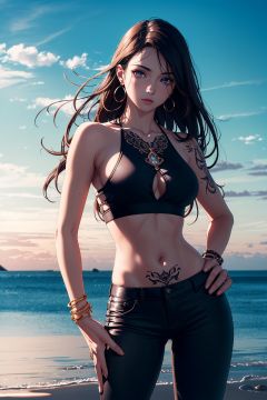 (masterpiece) , ((best quality)), (( 8k wallpaper)), ((ultra high resolution)), good composition, (ultra-detailed), illustration, beautiful art, artistic, realistic, beautiful, good art, scenery, cinematic, detailed skin, (oily skin), glossy skin, fine skin, (beautiful hair), (beautiful eyes), (perfect anatomy), (correct limb), (realistic), hand with five delicate fingers, cute girl, a woman posing for the camera that is wearing some black pants and has a cropped top on, 1girl, jewelry, solo, ring, earrings, long hair, bracelet, shirt, brown hair, tattoo, hand on hip,epic_skies