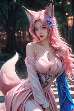 1girl, animal_ears, fox_ears, fox_tail, tail, solo, long_hair, hair_ornament, breasts, ahri, facial_mark, dress, necklace, hair_flower, pink_hair