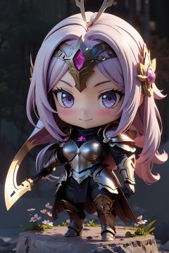 1girl,solo,long_hair,armor,chibi,holding,breasts,purple_eyes,smile,weapon,very_long_hair