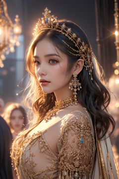 (((jellyfishforest))),queen,crown,forest,best quality, masterpiece, photorealistic:1, 1girl, dramatic lighting, from below,GdClth,gold-hair princece, ((((gorgeous)))) royal dress, ((((gorgeous)))) gold tiara, ((((gorgeous)))) gold necklace, ((((gorgeous)))) gold accessories, light on body,Blurred background,Extraordinary details,look back,the whole body,hand101,blue_IDphoto