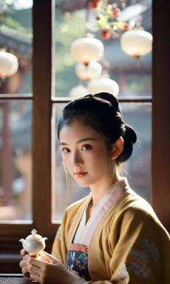 oriental fantasy,Evoking the charm of a folk tale,a girl::2 sits in a cozy tea house,her expression a mix of contentment and introspection. She holds a teacup delicately in her hand,and the warm light filtering through the windows adds a touch of nostalgia to the scene. The tea house's traditional architecture creates a sense of cultural richness.,