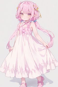 1girl,full_bod,hair flower,loli,elf,standing,long dress,pumps,pink hair, yellow eyes, hair cover one eye, hair tie, medium hair with long locks, low tied, low ponytail, long locks, solo locks,
