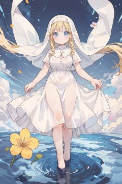 1girl,full_body,smile,blonde hair, long hair, blue eyes,long hair,large breasts,hair flower,loli,elf,nun,standing,long dress,pumps,floating dress