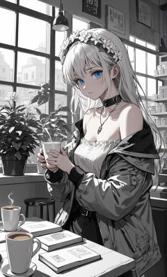 (monochrome:1.2), highly detailed, best quality, illustration, highres, extremely detailed wallpaper,sketch, flat color, anime screencap, , realistic, a beautiful girl, blue eyes, white hair, bangs, head gear, necklace, tattoo, off shoulder, jacket removed, planted_sword, coffee shop, indoors, windows, book stack,cups, pencil, mirror, plant, leaves, flowers, nature, wind, outdoors, reflection, depth of field, delicate foreground, extremely delicate background,