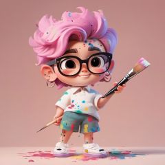 MG_ip,Pixar,1boy, solo, male focus, glasses, holding, chibi, paint, earrings, smile, jewelry, brown hair, paint splatter on face, pants, pink hair, paintbrush, looking at viewer, paint splatter, black eyes, short hair, holding paintbrush, standing, undercut, full body, palette \(object\), closed mouth, gradient background, black-framed eyewear, shirt, black footwear, gradient, round eyewear, painting, <lora:EMS-29950-EMS:1.2>