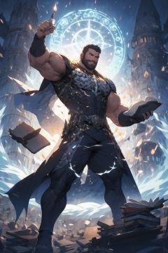 (masterpiece:1.2), best quality,PIXIV, Magic Circle,book,glowing,Muscular Male,dynamic pose,beard, holding a book, bare shoulder, gown,full_body, full shot, (dynamic pose:1.3)