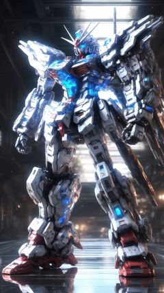 BJ_Gundam_SDXL,solo,blue_eyes,standing,no_humans,glowing,robot,mecha,clenched_hands,reflection,science_fiction,looking_ahead,v-fin,mobile_suit,3d model,8k,intricate,highly detailed,masterpiece,sidelighting,hdr,high definition,<lora:SDXL_Gundam_v3:0.7>,