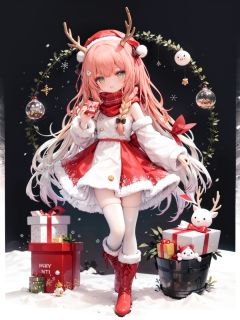 loli,1girl, golden hair, :d, long hair, food, cookie, christmas, reindeer, nail polish, solo, fur trim, scarf, christmas tree, gift, animal ears, checkerboard cookie, bow, sack, braid, gingerbread man, green background, christmas ornaments, blush, candy, simple background, hair ornament, full body, looking at viewer, gift box, red nails, holding, deer, red scarf, box, red bow, ;\), antlers, bell, flower, fur-trimmed boots, fur-trimmed sleeves, detached sleeves, very long hair, green eyes, hair bow, pinecone, snow globe, santa hat, star \(symbol\), hat, holly, stuffed animal, boots, sleeveless, animal, bangs,white thighhighs,
