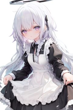 1girl, solo, apron, long hair, hair over one eye, white background, frills, braid, halo, long sleeves, dress, simple background, white hair, white apron, puffy sleeves, very long hair, frilled apron, maid, purple eyes, ribbon, parted lips, maid apron, bangs, juliet sleeves, black dress, neck ribbon, looking at viewer, single braid, blush