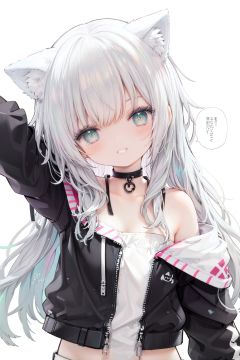 1girl,  solo,  green eyes,  smile,  long hair,  cat ears,  looking at viewer,  animal ears,  white background,  simple background,  bangs,  silver hair,  upper body,  speech bubble,  jacket,  black jacket,  head tilt,  bare shoulders,  eyebrows visible through hair,  off shoulder,  half-closed eyes,  grin,  arm up,  collarbonereflection light