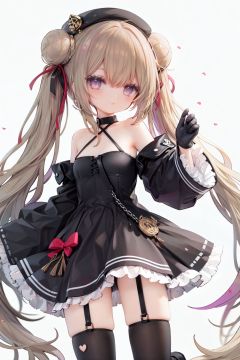 1girl, dress, double bun, hair bun, long hair, black dress, twintails, looking at viewer, smile, hat, bangs, brown hair, white background, solo, open mouth, blush, black headwear, very long hair, garter straps, thighhighs, bare shoulders, beret, :d, ribbon, black gloves, simple background, long sleeves, nail polish, black footwear, red ribbon, bow, gloves, wide sleeves, animal, hair ribbon, boots, red nails, sheath, sheathed, hair between eyes