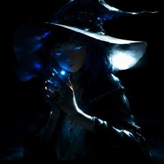 masterpiece,best quality,1girl, solo,upper body, hat, closed mouth,medium hair, blue eyes, looking at viewer,   blue hair,black hair, white dress, long sleeves,  lips, glowing,  monochrome, jewelry, dark, sitting,black background,