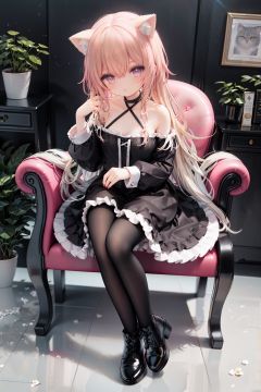 masterpiece, ((best quality)),  dynamic angle, chromatic aberration, ((colorful)),1girl, animal ears, dress, tail, solo, long hair, pantyhose, purple eyes, cat ears, cat, cat girl, cat tail, black dress, white pantyhose, standing, indoors, black footwear, animal ear fluff, looking at viewer, flower, off shoulder, full body, frilled dress, brown hair, long sleeves, blush, bangs, plant, choker, bare shoulders, potted plant, wooden floor, black choker, frills, boots, parted lips, very long hair, animal, blonde hair, chair, bow, collarbone, puffy sleeves, hair between eyes, shoes, black collar