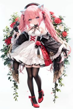 masterpiece, ((best quality)),  dynamic angle, chromatic aberration, ((colorful)),1girl, solo, flower, thighhighs, white thighhighs, gloves, red footwear, long hair, detached sleeves, animal ears, rose, blonde hair, looking at viewer, full body, hat, high heels, petals, dress, standing, twintails, wide sleeves, holding, shoes, frills, red flower, cat ears, bangs, microphone, long sleeves, white flower, hair ornament, white gloves, zettai ryouiki, bare shoulders, pink eyes, frilled dress, small breasts, breasts, closed mouth, skirt, beret, white headwear, very long hair, red eyes, red rose, white dress, blush, ribbon, black gloves, animal ear fluff, hair flower, pink flower