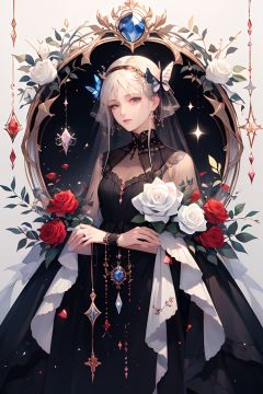 qztarot, flower, red flower, rose, no humans, red rose, gem, crystal, white flower, solo, thorns, sparkle, white rose, red gemstone, black background, bug, butterfly, Tarot card