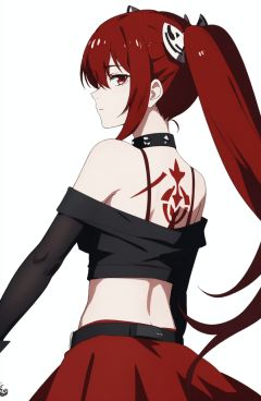 1 girl, back tattoo,(blank eyes,expressionless:1.2),medium breasts,anarchy (mahou shoujo magical destroyers), red hair, red ribbon,twin tails, red eyes, two black water drops tattoo, black necklace of thorns, black shirt written rage, red skirt, red socks, black boot, perfectly detailed, best quality,
