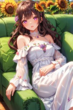 1girl,flower,purple_flower,yellow_flower,long_hair,couch,solo,white_flower,white_dress,looking_at_viewer,pink_flower,plant,purple_eyes,hair_flower,off_shoulder,on_couch,on_back,sunflower,long_sleeves,brown_hair,hair_ornament,lying,bangs,dress,rose,hydrangea,day,parted_lips