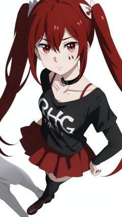 1 girl,full body,(blank eyes,expressionless:1.2),medium breasts,anarchy (mahou shoujo magical destroyers), red hair, red ribbon,twin tails, red eyes, two black water drops tattoo, black necklace of thorns, black shirt written rage, (red skirt, red stockings, black boot), perfectly detailed, best quality,