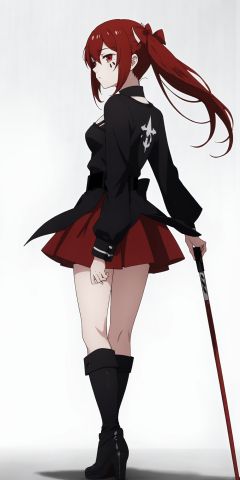 1 girl,full body,(blank eyes,expressionless:1.2),medium breasts,anarchy (mahou shoujo magical destroyers), red hair, red ribbon,twin tails, red eyes, two black water drops tattoo, black necklace of thorns, black shirt written rage, (red skirt, red stockings, black boot), perfectly detailed, best quality,