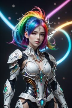 surreal photography of a stunning beautiful cyborg female, rainbow hair, huge breast, (beauty and detailed armor), embraced, delicate white filigree, intricate filigree, glowing, navel, highly detailed, intricate detailed, face symmetry, masterpiece, award-winning, sharp focus, concept art, low key, 8k, uhd, low key, octane render
