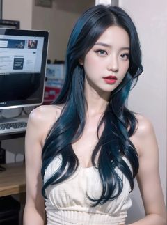 a blue hair,The girl in the white dress,Behind is the newspaper background,Red lipstick on his face,Artgerm,Animation art style,Computer Graphics,Computer Arts,Asians, <lora:girl_20230627111121:0.6>