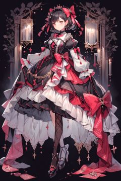 qzclothesdesign, dress, 1girl, lolita fashion, bow, black dress, fishnets, frills, black footwear, puffy sleeves, gothic lolita, long sleeves, solo, frilled dress, black bow, pantyhose, high heels, white bow, english text, full body, standing, layered dress, cross-laced clothes, corset, asymmetrical legwear, dress bow, hair bow, three visions