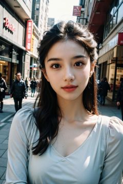 best quality, hyper realism, (ultra high resolution), masterpiece, 8K, RAW Photo,1girl,<lora:不要油光和网红脸的loraV2:0.7> ,outdoor,walking in the street,stores,malls,crowedded street,fashion silk dress,(beautiful face:1.8),