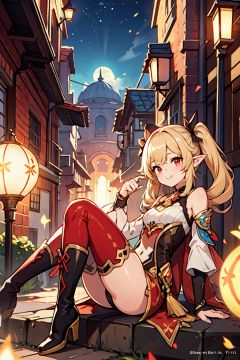 1 cute girl\(lovely,smile,blonde hair,long sleevesdress,low twintails,red eyes,pointy ears,long hair,knee boots,ribbed legwear\),dodoco \( jumpy dumpty,charm object,Natural skin texture,ultra-realistic realism,the soft light,sharp\), masterpiece,best quality,best shadow,official art,unity 8k wallpaper,ultra detailed,cinematic lighting,klee (genshin impact)