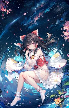 masterpiece, ultra detailed,((from above ,socks, lying, underwater, floating hair, starry sky reflection, floating sakura petals, rippling)),[half closed eyes],(pink eyes),(high contrast:0.8),1girl,solo, hakurei_reimu, hair_tubes, detached_sleeves, solo, bow, long_hair, frills, ribbon_trim, red_bow, hair_bow, ribbon-trimmed_sleeves, wide_sleeves, red_skirt, skirt, looking_at_viewer, ascot, stairs, frilled_bow, black_hair, holding apple, <lora:水润RenalithV4(改):0.8>, <lora:博丽灵梦:0.9>,<lora:neg4all_bdsqlsz_V3.5:1.2>