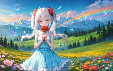 ((masterpiece:1.4, best quality))+, (ultra detailed)+,1girl, (loli:1.4),silver hair, twintails,very long hair,  blue eyes,medium breasts, (Milky Way:1.05),(beautiful snowflakes:1.2), geometric landscapes, natural cycles,(rainbow, beautiful butterfly:1.3),(((holding a flower,horizon,holding,flower field,standing,cowboy shot,medium shot,upper body))),(peach blossom:1.2),mountain horizon,scenery,
