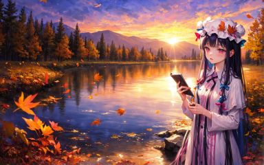 ((patchouli_knowledge)), 1girl,orange_sky, sunset, twilight, autumn, autumn_leaves, fire, gradient_sky, mountainous_horizon, evening, dusk, 1girl, red_sky, cloud, mountain, scenery, campfire, cloudy_sky, sky, sun,tree, outdoors,solo, long_hair, horizon, building, lake, river, water, sunrise, cityscape, purple_sky, holding, holding_leaf, city, ocean, leaf,