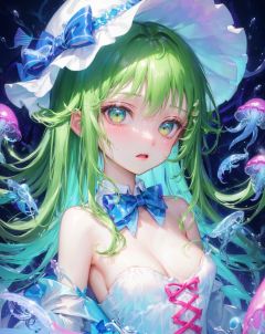 ((masterpiece)),(illustration),(((best quality)),iridescent, ((beautiful detailed girl)),jellyfish_girl,small breast,upper_body, (delicate cute face),lovestruck,(iridescent eyes), ((floating_hair)),iridescent,(jellyfish_hat),bow, dark_blue dress,bowties,laces,ribbons,pearl, (in deep_sea),fishes,(jellyfish),beautiful landscape,(gumi)