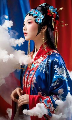 : A captivating photograph capturing the essence of a Chinese opera-inspired scene. A young girl dressed in an intricate Chinese opera costume, adorned with xifu clothes, moves gracefully amidst swirling ink-like fluidic effects. The girl's elegant and poised motion complements the fluidic surroundings. The color palette features a striking combination of red and blue, creating a visually arresting contrast. The scene unfolds in a creatively designed setting, with a hint of traditional ink painting textures. The fluidic elements surround the girl, accentuating the sense of movement and energy. Particles dance around, adding a touch of magic to the composition. The photograph incorporates double exposure techniques, resulting in a unique and artistic composition. Creative lighting and shadows play a pivotal role in enhancing the emotional impact of the image. The camera captures this mesmerizing moment in high resolution, highlighting the finest details.