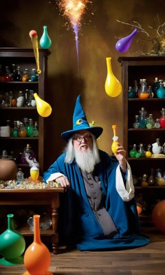 A whimsical and hilarious photograph captures a bumbling wizard::2 in a comical mishap::3 The scene is set in a chaotic laboratory filled with colorful potions and peculiar contraptions. The wizard,with a comically oversized hat and a mismatched outfit,is surrounded by floating objects and a trail of silly special effects. The photograph employs creative composition::3 and bold framing::3 to emphasize the wizard's clumsy antics. Playful lighting creates a sense of chaos and adds to the humor of the scene. Shot with a Nikon Z6,f/2.8 aperture,ISO 800,shutter speed 1/100.,