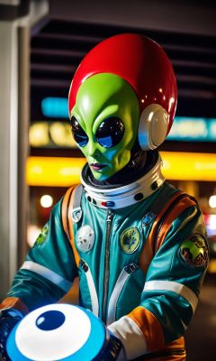 In a whimsical retro-futuristic photograph,we find a playful alien visitor::3 wreaking havoc on Earth. This mischievous extraterrestrial,clad in a colorful alien spacesuit with alien symbols and patterns,is causing chaos with a grin::3 The composition is daring,with the alien occupying the foreground while chaos unfolds in the background,adding a touch of humor and creativity to the scene. The lighting casts surreal shadows,emphasizing the absurdity of the situation. The photograph aims to capture the hilarity of an alien's antics on our planet. Shot with a Fujifilm X-T4,f/1.4 aperture,ISO 800,shutter speed 1/1000.,