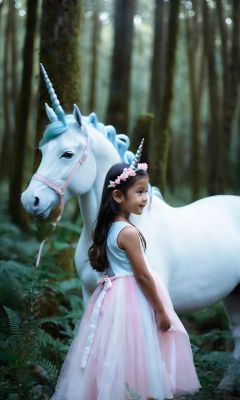A whimsical photograph captures the magical moment when a young girl encounters a legendary magic unicorn::3  with white horn on the head in a fantastical forest. The scene is bathed in dreamlike hues of pastel pinks and soft blues::3,creating an enchanting atmosphere. The composition is daring,with the girl and the unicorn positioned off-center,emphasizing the vastness of the mystical forest::4 Creative special effects add an ethereal touch,making the unicorn appear as if it's emerging from another realm. The interplay of creative lighting and shadows adds depth and emotion to the scene,conveying the girl's awe and wonder. Shot with a Nikon Z7,f/2.8 aperture,ISO 200,shutter speed 1/400.,