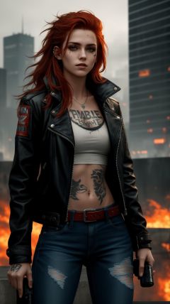 A dazzling snapshot of a red-haired rebel in a leather jacket and jeans, standing on a rooftop of a dystopian city. Her face is fierce and confident, with piercing eyes and a smirk. Her hair is wild and messy, reflecting her rebellious spirit. Her jacket and jeans are worn and torn, revealing her tattoos and scars. She holds a gun in one hand and a spray can in the other, ready for action. The image is gritty and realistic, with every detail rendered in 8k resolution. The lighting is dark and moody, creating a contrast with her fiery hair. The background is chaotic, with explosions, smoke and graffiti. The image is a work of ********** and attitude, showcasing the girl’s courage and charisma. She looks like a nightmare come true, a perfect blend of badass and sexy, like a cyberpunk heroine.