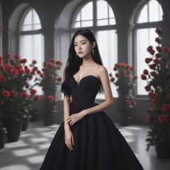 masterpiece, 1 girl, 22 years old, Look at me, Exquisite makeup, Black hair, Long hair, black dress, Indoor, Exquisite decoration, Bright light, Stand, In the middle of the picture, Whole body, Plenty of roses, textured skin, super detail, best quality<lora:TrueLove-000007:0.5>