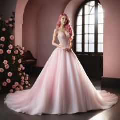 masterpiece, 1 girl, 22 years old, Look at me, Exquisite makeup, Pink hair., Long hair, white wedding dress, Wipe the chest, Indoor, Exquisite decoration, Bright light, Stand, In the middle of the picture, Whole body, Plenty of roses, textured skin, super detail, best quality<lora:TrueLove-000007:0.5>