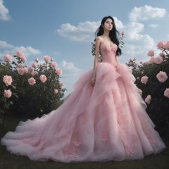 masterpiece, 1 girl, 22 years old, Look at me, Exquisite makeup, Black hair, Long hair, Pink wedding dress, Outdoor, Light blue sky, Clouds, Garden, Stand, In the middle of the picture, Whole body, Plenty of roses, textured skin, super detail, best quality<lora:TrueLove-000007:0.5>