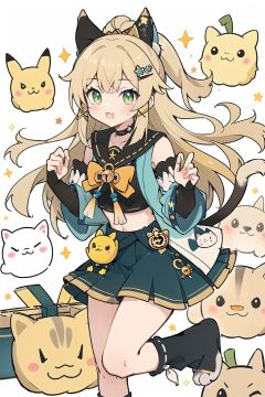 yll, 1girl, green eyes, long hair, tail, hair ornament, bangs, animal ears, blonde hair, skirt, black choker, pleated skirt,yll