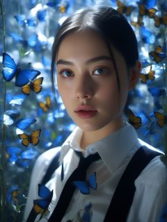 BJ_Blue_butterfly,1girl,solo,looking_at_viewer,shirt,black_hair,white_shirt,parted ips,collared_shirt,blurry,black_eyes,lips,bug,golden butterfly,realistic,nose,blue_butterfly,lipstick,Photographic,Analog Film,photo,8k,digital photography,masterpiece,sidelighting,hdr,realistic,(high definition:1.2),(best quality, masterpiece, photorealistic, realistic),(finely detailed beautiful eyes:1.2),<lora:Blue_butterfly_SDXL_test1:0.7>,