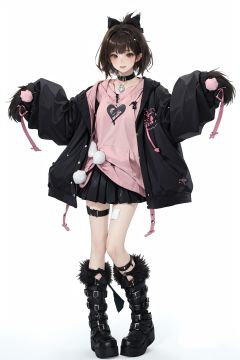 qzchuanda, 1girl, solo, boots, brown hair, white background, full body, simple background, black footwear, sleeves past wrists, skirt, hood, hoodie, thigh strap, choker, standing, collar, hair bow, short hair, brown eyes, bow, pom pom \(clothes\), fur trim, long sleeves, sleeves past fingers, jewelry, sweater