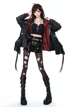 qzchuanda, 1girl, solo, torn clothes, fashion, pantyhose, skirt, torn pantyhose, brown hair, leather, jacket, boots, leather jacket, jewelry, necklace, belt, brown eyes, white background, long hair, realistic, pencil skirt, full body