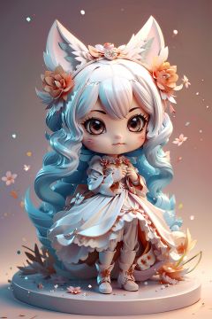 1girl,solo,dress,hair_ornament,chibi,long_hair,animal_ears,white_hair,white_dress,flower