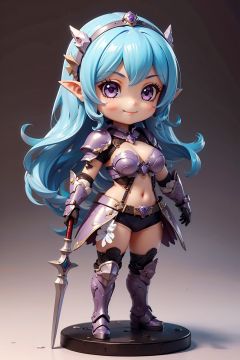 1girl,solo,long_hair,armor,chibi,holding,breasts,purple_eyes,smile,weapon,very_long_hair